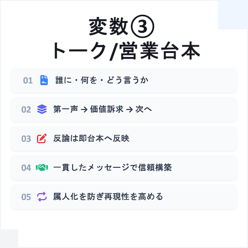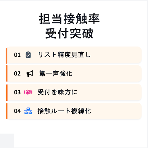 2、担当接触率(受付突破):受付で切られているなら、導入トークかリスト選定(鉄則1,4)を見直す。