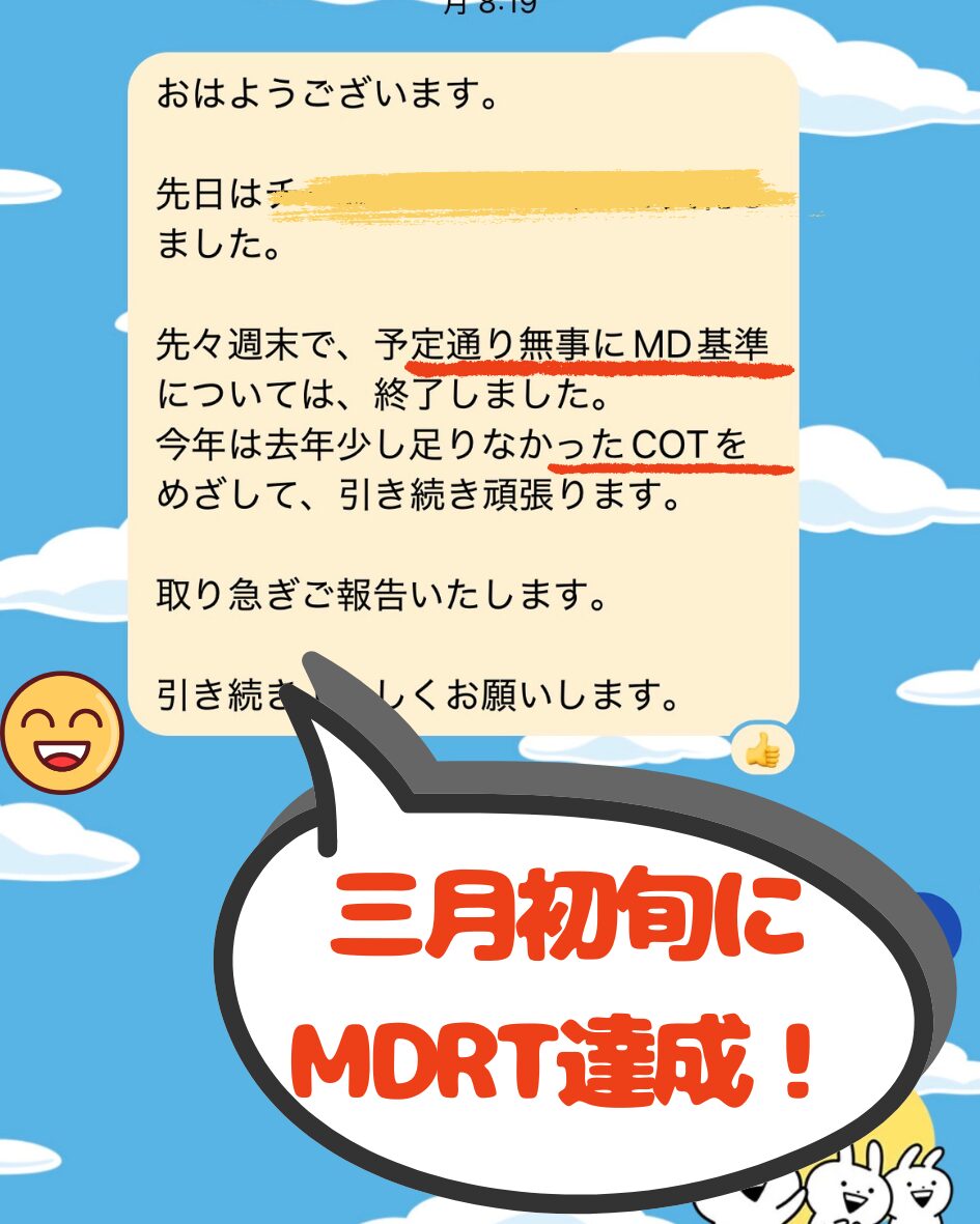3月初旬に、MDRT達成! 引き続き頑張ります。(2026年)